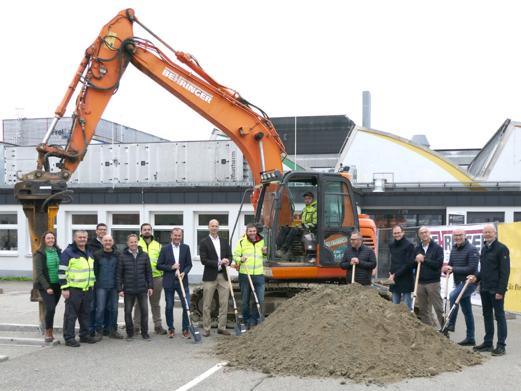 Groundbraking: from left to right: Anna Gut, Paul Wenzinger, Jörg Müller, Daniel Buchner, Herr Stumpp, Construction manager Stefan Wurm, Roland Bäurer, Dr. Rainer Frei, Johannes Behringer, Niklas Kaltenbrunner, Jürgen Schoner (company PGS), Micha Bächle, Hans-Peter Frei, Peter Gärtner (architec), Dr. Georg Baum (mayor)